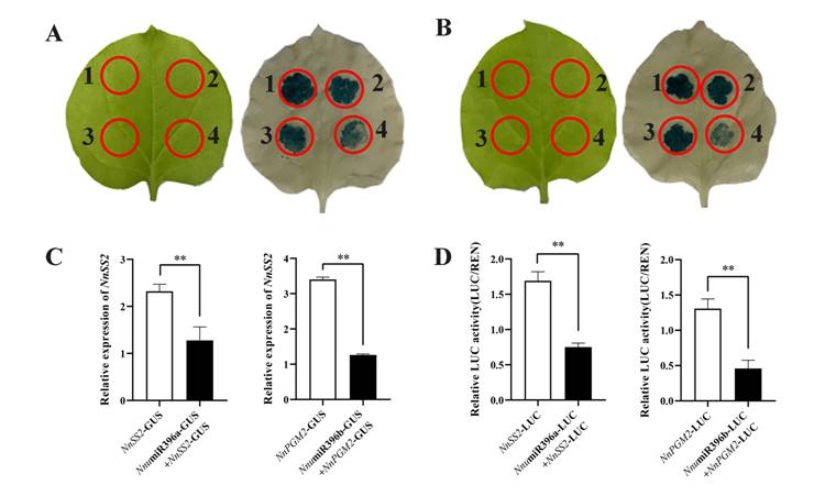此外,该研究还探讨了涉及淀粉生物合成的两条miRNAs介导途径:NnumiR396a-NnSS2和NnumiR396b-NnPGM2的潜在规律。qRT-PCR分析、瞬时共表达实验和双荧光素酶分析全面证实了这两个miRNAs与其靶基因之间的负调控关系。与根状茎三节间的淀粉含量相比,我们可以进一步得出以下结论:NnumiR396a下调NnSS2的表达并最终影响支链淀粉的合成,NnumiR396b下调NnPGM2的表达并最终影响总淀粉的合成(图2)。我们的结果表明,miRNAs在莲藕根茎中的淀粉生物合成中起着关键作用,并且miRNAs介导的网络可以调节该组织中的淀粉生物合成。这些结果为莲藕根茎发育过程中淀粉生物合成的分子机制提供了重要的见解。