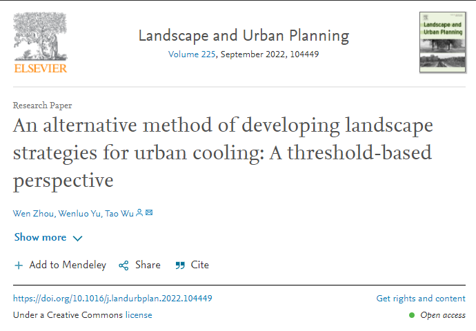 近日,国际知名城市规划期刊《Landscape and urban planning》(IF=6.142)在线发表了我院景观设计团队题为“An alternative method of developing landscape strategies for urban cooling: A threshold-based perspective”的研究论文,该论文提出了一种基于阈值视角和城市热环境缓解的景观策略制定方法。
