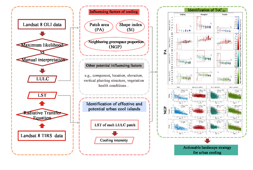 城市景观格局的变化是引起城市热岛效应的重要原因之一,如何通过优化景观格局以达到缓解城市热环境的作用,得到国内外很多学者的关注。该研究提出了以“4 Identifications”为四个主要步骤的城市冷岛研究的新方法,通过识别城市中的“有效冷岛”和“潜在冷岛”;识别相关影响因素及其重要性;识别各影响因子保证冷岛效应的绝对阈值;最终识别最低成本的可实施景观策略。该研究以北京、上海和天津为主要研究区域,通过最大似然法结合目视解译获取的用地分类图和大气校正法反演的热力图为数据基础,研究了斑块的面积,形状复杂度和周边绿地占比对各用地类型内部温度的影响,并通过构建回归模型提取各自绝对阈值,最后提出了针对各用地类型的热环境缓解相关景观策略。该研究成果可以为城市冷岛研究提供新的思路和方法。