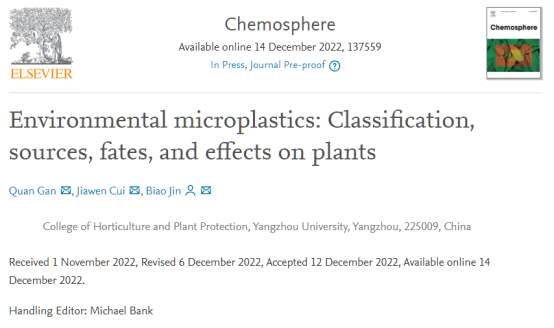 我院硕士研究生干泉为Environmental microplastics: classification, sources, fates, and effects on plants的综述论文的第一作者,金飚教授为通讯作者,师资博士后崔佳雯参与了该综述的部分内容,扬州大学园艺与植物保护学院为第一署名单位。