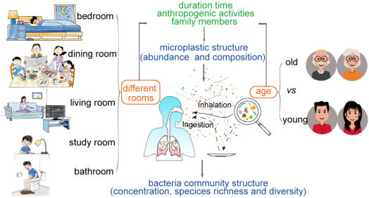 随着塑料制品的广泛使用,废弃塑料对环境的污染日益严重,已成为全球关注的环境问题之一。由于无法生物降解,废弃的塑料垃圾经过长期风化通常降解成直径从0.1到5000微米不等的微塑料 (Microplastics) 颗粒,扩散到地球几乎所有的角落。前人已经对自然环境中的微塑料含量和成分进行了大量研究,然而城市居民大部分时间是在室内,其中约60%的时间是在家里,但普通家庭室内空气中的微塑料含量分布和沉降的相关细菌类型还未见报道。在Indoor microplastics and bacteria in the atmospheric fallout in urban homes的研究论文中,课题组根据人们在家庭房间的日常生活习惯以及每个房间的使用时间,收集了20个家庭常见的5种类型房间(卧室、卫生间、客厅、餐厅、书房)共100个采样点空气中的微塑料样品,利用激光红外成像仪 (Agilent 8700 LDIR analyzer) 对微塑料数量、颗粒大小、形状和化学成分进行测定分析。此外,收集空气中沉降的细菌进行培养,结合高通量测序和菌落鉴定观察,测定了家庭室内空气中细菌的浓度和群落结构。一共鉴定到47904个颗粒 (空气中沉降的所有颗粒),其中微塑料颗粒23889个,这是迄今为止室内环境中鉴定到数量最多、范围最广的空气沉降微塑料数据。主要结果显示,不同房间的微塑料浓度波动范围较大,聚酰胺 (PA), 聚氨酯 (PU), 聚乙烯 (PE) 和聚对苯二甲酸乙二酯 (PET) 是最多的四种微塑料类型。有趣的是,老年人家庭和年轻人家庭室内微塑料和细菌特征存在显著不同:老年人家庭中室内空气微塑料浓度、细菌浓度、F/B比值(与人类衰老与健康状况有关) 和潜在致病菌水平明显高于年轻人家庭。进一步分析原因,可能是与居住者年龄、活动持续时间和强度,以及房间的家具类型和清洁习惯有关。相关性分析显示,PA、PU和PE的浓度与主要附着细菌浓度呈正相关关系。此外,该研究还发现一个有趣的现象,普通家庭室内一个近似于茶杯口大小 (直径6 cm) 的面积上一昼夜 (24小时) 沉降的平均微塑料颗粒约为609个,最大值可达2000多个。这些发现为研究环境空气中微塑料和细菌之间的相互作用提供了直接证据,也为城市居民日常生活环境中暴露于微塑料的潜在风险提供了实验数据。