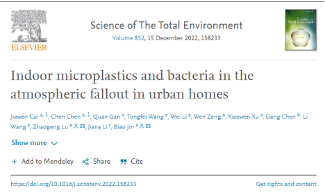 近日,我院金飚课题组在Science of the total environment (IF=10.75) 和Chemosphere (IF=8.943) 发表了题为Indoor microplastics and bacteria in the atmospheric fallout in urban homes的研究论文和Environmental microplastics: classification, sources, fates, and effects on plants的综述论文。