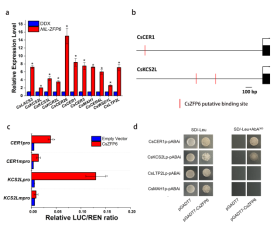 根据RNA-seq及后续的KEGG分析,‘DDX’的亮度表型与蜡质合成相关。通过GC-MSqRT-PCR证实,‘DDX’果皮中的蜡质含量及相关基因表达量下调。此外,烟草瞬时转化实验和酵母单杂实验表明,CsZFP6能转录调控蜡质合成相关基因CsKCS2CsCER1的表达。因此,CsZFP6可能通过调控蜡质合成从而影响黄瓜果皮亮度。