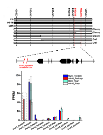 进一步通过精细定位,将glf1 定位在黄瓜第5号染色体SNP005 SNP006之间的111.6 kb区间内,该区间包括10个候选基因。结合基因组序列和基因表达分析,确认编码C2H2类锌指蛋白CsZFP6CsaV3_5G028870黄瓜果皮亮度的候选基因,‘DDX’CsZFP6完全缺失而呈现亮果皮特征。