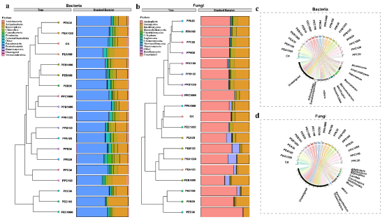 (a) 门水平上细菌相对丰度层次聚类图和堆叠柱状图;(b) 门水平上真菌相对丰度层次聚类图和堆叠柱状图;(c) 属水平上细菌相对丰度和弦图;(d) 属水平上真菌相对丰度和弦图