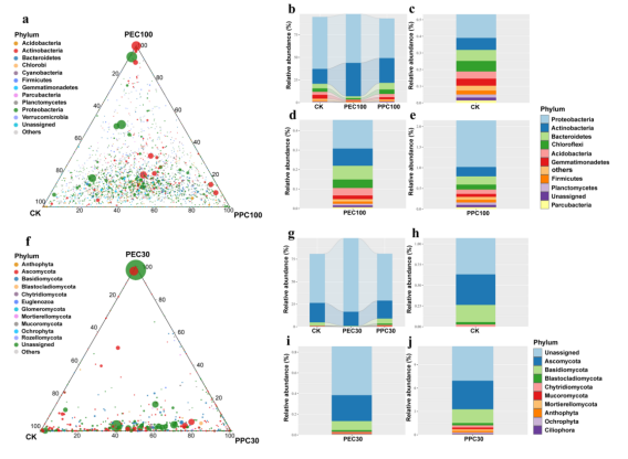 (a)CK、PEC100和PPC100处理下细菌OTU三元图;(b-e):CK、PEC100和PPC100处理下共有细菌相对丰度柱状图(b)以及CK(c)、PEC100(d)和PPC100(e)处理下特有细菌的相对丰度柱状图;(f) CK、PEC30和PPC30处理下真菌OTU三元图;(g-j):CK、PEC30和PPC30处理下共有真菌相对丰度柱状图(g)以及CK(h)、PEC100(i)和PPC100(j)处理下特有真菌的相对丰度柱状图