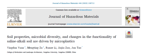 近日,我院陶俊教授团队在国际学术期刊《Journal of Hazardous Materials》(中科院一区Top期刊,IF=14.224)发表了题为“Soil properties, microbial diversity, and changes in the functionality of saline-alkali soil are driven by microplastics”的研究论文,解析了微塑料对盐碱地土壤特性及其微生物多样性与功能的影响。
