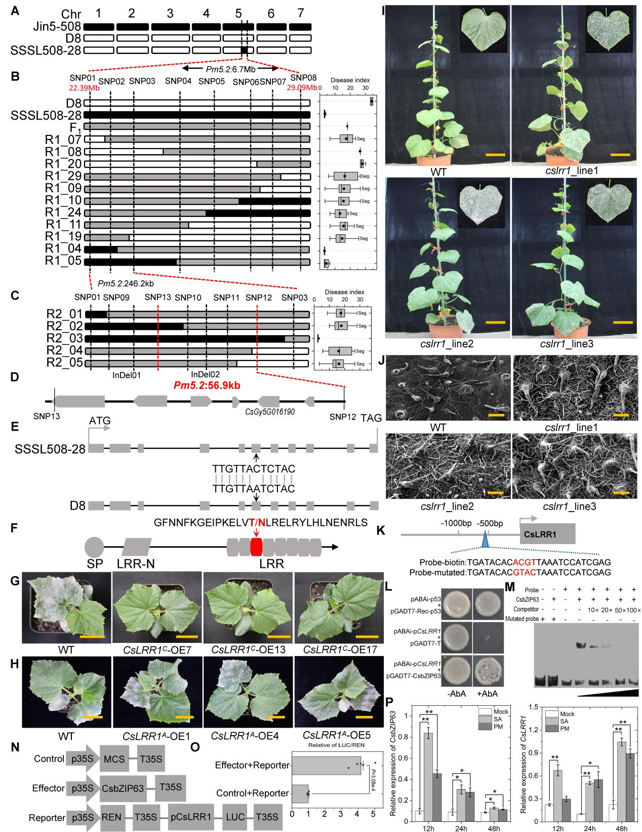 该研究前期利用黄瓜高抗白粉病亲本JIN5-508与高感白粉病亲本D8杂交、连续12代回交并自交及分子标记辅助选择,获得了一个遗传背景与感病亲本D8高度相似但高抗白粉病的染色体片段代换系SSSL508-28。通过重测序及比对发现,SSSL508-28在Chr5上带有一个~6.7Mb的供体片段。通过构建次级F2群体及精细定位,将该主效QTLPm5.2缩短至 56.9-kb区间内(图1)。结合序列比对及基因表达分析,明确编码仅含有富亮氨酸重复(LRR)结构域的CsLRR1为关键候选基因。SSSL508-28与D8间CsLRR1的编码区存在一个苏氨酸(Thr171,ACT,SSSL508-28)-天冬酰胺(Asp171, AAT,D8)的非同义突变,位于编码蛋白N端第3个LRR结构域上。蛋白三维结构模拟分析发现,该非同义突变导致CsLRR1蛋白的空间结构发生变化。过表达CsLRR1增强了黄瓜对白粉病的抗性,而敲除该基因则导致抗性下降(图1)。通过酵母单杂、EMSA、双荧光素酶实验明确了水杨酸信号通路关键转录因子CsbZIP63与CsLRR1启动子区域的TCA-element元件结合并激活其表达(图1)。外源水杨酸处理促进了CsbZIP63与CsLRR1的表达(图1)。沉默CsbZIP63导致黄瓜白粉病抗性下降。