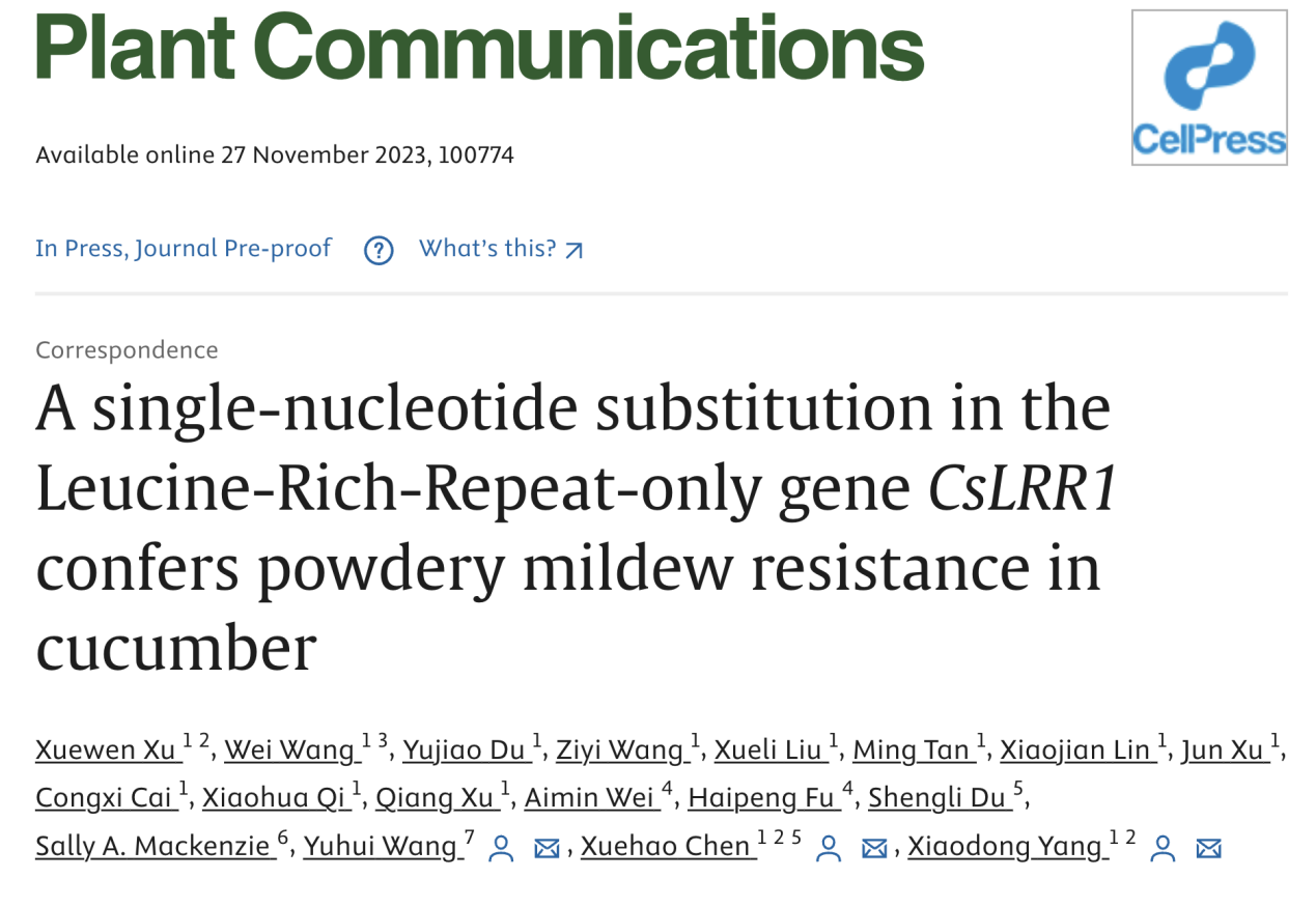 2023年11月28日,Plant Communications(中科院一区Top期刊,IF=10.5)在线发表了扬州大学园艺园林学院黄瓜遗传育种与分子生物学创新团队联合美国宾夕法尼亚州立大学Sally A. Mackenzie教授、天津市农业科学院杜胜利研究员、南京农业大学园艺学院王瑜晖副教授的题为“A single-nucleotide substitution in the Leucine-Rich-Repeat-only gene CsLRR1 confers powdery mildew resistance in cucumber”的研究成果。该研究首次鉴定并报道了一个调控黄瓜白粉病抗性的新基因并对其功能及调控机制进行了研究,为今后黄瓜抗白粉病分子遗传改良及新品种选育提供了优异基因资源。