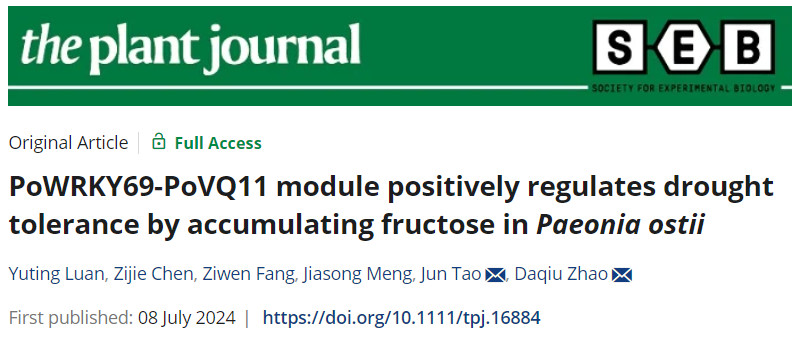 2024年7月9日,《The Plant Journal》杂志在线发表了我院花卉种质资源创新与分子生物学团队的研究论文“PoWRKY69-PoVQ11 module positively regulates drought tolerance by accumulating fructose in Paeonia ostii”。该研究首次鉴定了凤丹耐旱响应模块PoWRKY69-PoVQ11并解析了其通过促进干旱胁迫下果糖积累来调控凤丹耐旱性的分子机制。