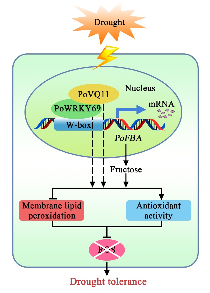 该研究首先发现一个属于WRKY IIe类转录因子PoWRKY69,它在干旱处理后的凤丹叶片中高表达、具有转录激活活性。随后,通过VIGS技术和烟草异源过表达等实验证明PoWRKY69具有正向调节凤丹耐旱性功能,并且沉默PoWRKY69凤丹的叶片可溶性糖含量显著降低,ROS积累量显著上升。对调控糖代谢相关基因筛选后发现,果糖-1,6-二磷酸醛缩酶基因(PoFBA5)表达在沉默植株中显著下调;运用酵母单杂、EMSA和双荧光素酶实验进一步验证发现PoWRKY69能直接结合PoFBA5启动子,并激活其表达。通过VIGS技术和烟草异源过表达等实验证明PoFBA5正向调节果糖积累和耐旱性。在此基础上,通过互相蛋白质筛选结合酵母双杂交、双分子荧光互补和荧光素酶互补等实验,进一步发现PoVQ11能够与PoWRKY69互作,并且互相作用能够增强PoWRKY69对PoFBA5基因的表达调控。