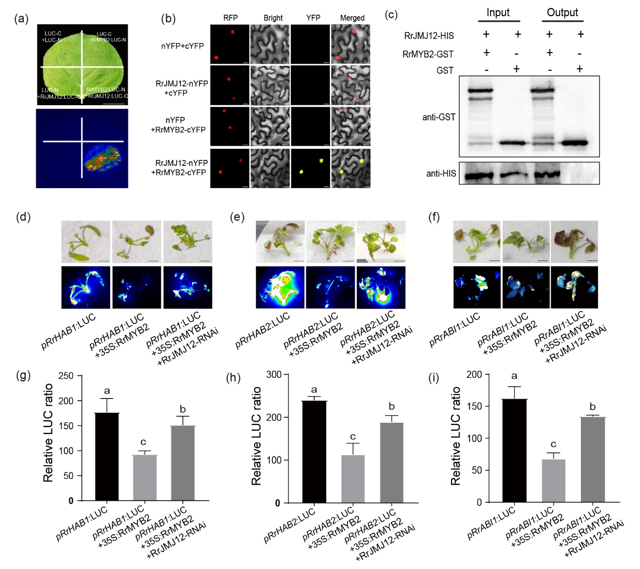 为了进一步验证这一猜想,该研究通过BiFC和Pull down等实验,验证了二者之间存在蛋白互作关系(图3a-c)。进一步通过荧光素酶实验,发现RrMYB2抑制靶基因的表达依赖于RrJMJ12。在干扰RrJMJ12的背景下,RrMYB2对靶基因的抑制作用几乎消除(图3d-i)。综合这两个研究结果,表明了RrJMJ12是RrMYB2负调控靶基因的共调节因子。