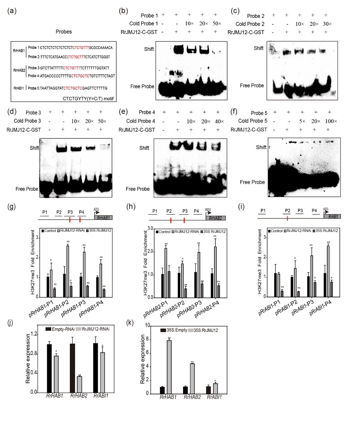为了研究RrMYB2是否直接调控这些靶基因的表达,该研究首先分析了启动子序列,发现靶基因启动子上包含有MYB结合位点。因此进行了一系列生化实验,但结果都表明,RrMYB2不直接抑制靶基因的表达,暗示可能需要其他共调节因子。进一步对启动子进行分析,发现启动子上都包含后CTCTGYTY元件,该元件是组蛋白去甲基化酶JMJ12的特异性结合位点,因此猜测RrJMJ12可能是RrMYB2的共调节因子。为了验证这一猜想,本研究首先通过EMSA实验验证了RrJMJ12能够直接靶向靶基因启动子上的CTCTGYTY元件(图2a-f)。而且,瞬时过表达和抑制RrJMJ12,均能改变靶基因上的H3K27me3修饰水平(图2g-k)。这一结果表明,PP2Cs靶基因的表达受到了RrJMJ12的直接表观修饰调控。