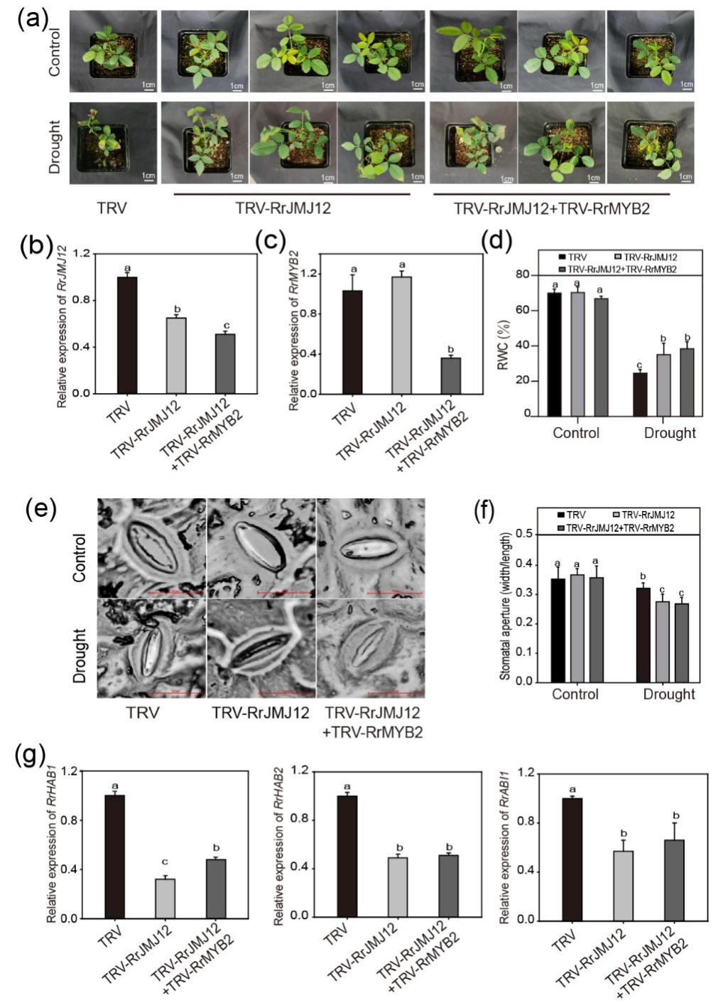 接下来,通过毛状根技术构建了玫瑰RrJMJ12沉默株系和过表达株系,干旱处理后,发现过表达株系抗旱性显著低于对照,相反,干扰株系抗旱性显著高于对照,表明RrJMJ12是抗旱的负调控因子。为了进一步验证RrMYB2和RrJMJ12的功能关系,研究人员同时沉默了RrMYB2和RrJMJ12,结果发现,同时沉默二者的株系表现为抗旱性增强,气孔变小,相对含水量高于对照,这一结果表明RrJMJ12在RrMYB2下游发挥作用(图4)。