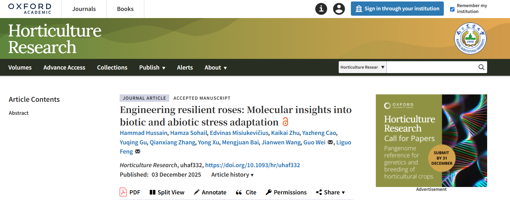 近日,国际园艺领域TOP期刊《Horticulture Research》(影响因子8.5,五年影响因子9.1)在线发表了扬州大学园艺园林学院冯立国教授团队题为“Engineering resilient roses: Molecular insights into biotic and abiotic stress adaptation”的综述论文,系统总结了玫瑰等蔷薇属植物生物与非生物胁迫适应性分子机制相关研究进展。