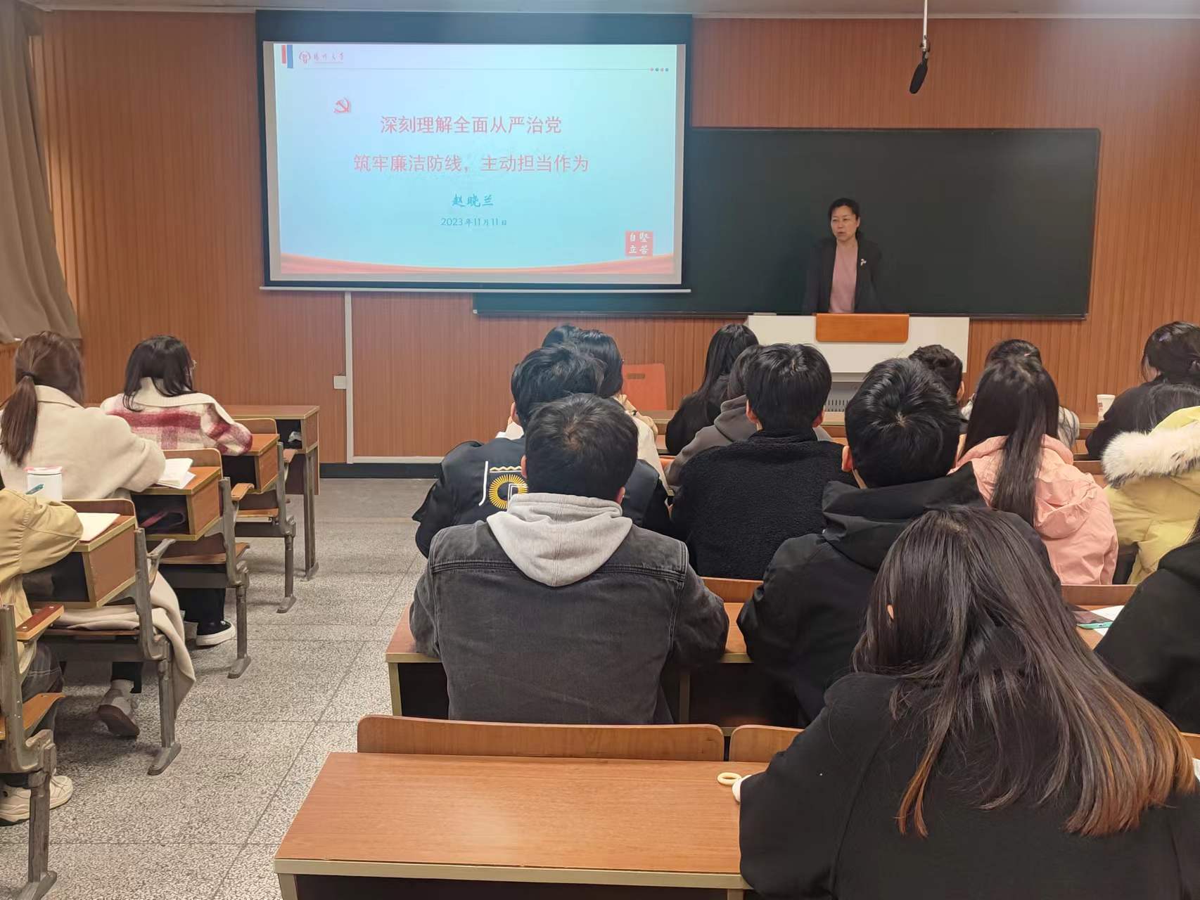 赵晓兰书记以《深刻理解全面从严治党 筑牢廉洁防线 主动担当作为》为题,从“坚守党的初心使命,严守党的纪律,提高政治站位、忠诚履责”三个方面阐释“坚持全面从严治党在路上,党的自我革命永远在路上”这一主题。赵书记向发展对象提出要求:“要自觉加强理论学习和理论武装;要自觉锤炼政治品格;要自觉强化政治担当意识;要将爱国、爱校之情融入到具体行动中,深刻理解‘坚苦自立’内涵,做一名具有大德、大智、大气和鲜明扬大烙印的新时代好青年。”