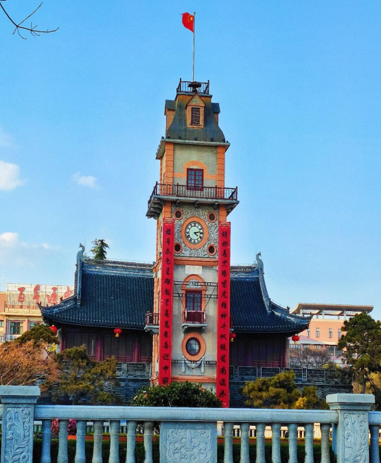 南通谯楼始建于宋淳熙年间,是用于瞭望的戍楼。民国三年,张謇与其兄在上海买来巨钟在谯楼前由南通建筑师孙支厦设计并建造了南通钟楼,风格上受西方艺术的影响。在这两建筑后是闻名遐迩的百年通中——南通中学。