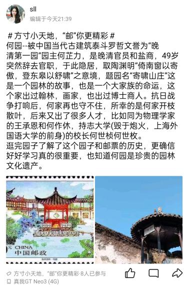 扬州是一座具有深厚历史底蕴和文化内涵的城市,扬州的园林和运河也曾多次出现在国家发行的邮票上面。此项活动需要参与者提前上网了解与扬州有关的各类邮票,如:瘦西湖、大运河等。同时也需要通过线上了解邮票历史背景和线下实地参观相结合的方式,表达自己对该邮票的看法,并在 QQ 空间进行打卡。