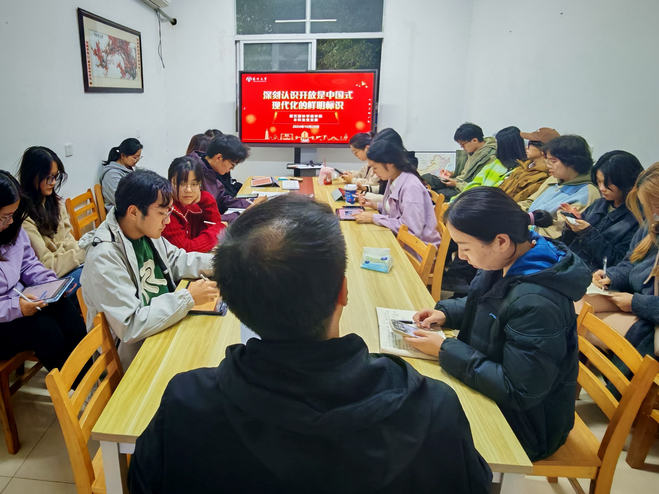 为深入学习贯彻党的二十届三中全会精神,学院研究生会近日组织专题学习活动,聚焦“开放是中国式现代化的鲜明标识”主题。活动中,研究生会成员集体学习全会公报,围绕开放政策与现代化建设的内在联系展开讨论。