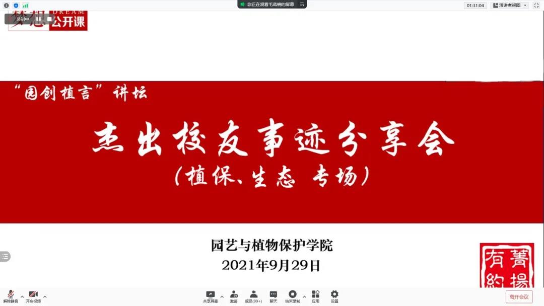 2021年9月29日晚上七点,学院通过线上腾讯会议的形式,为刚入校的大一新生开展了“园创植言”讲坛——杰出校友事迹分享会。会议分植保、生态专场与园艺、园林专场,通过与杰出校友们的交流,同学们也初步对自己进行了三涯规划。