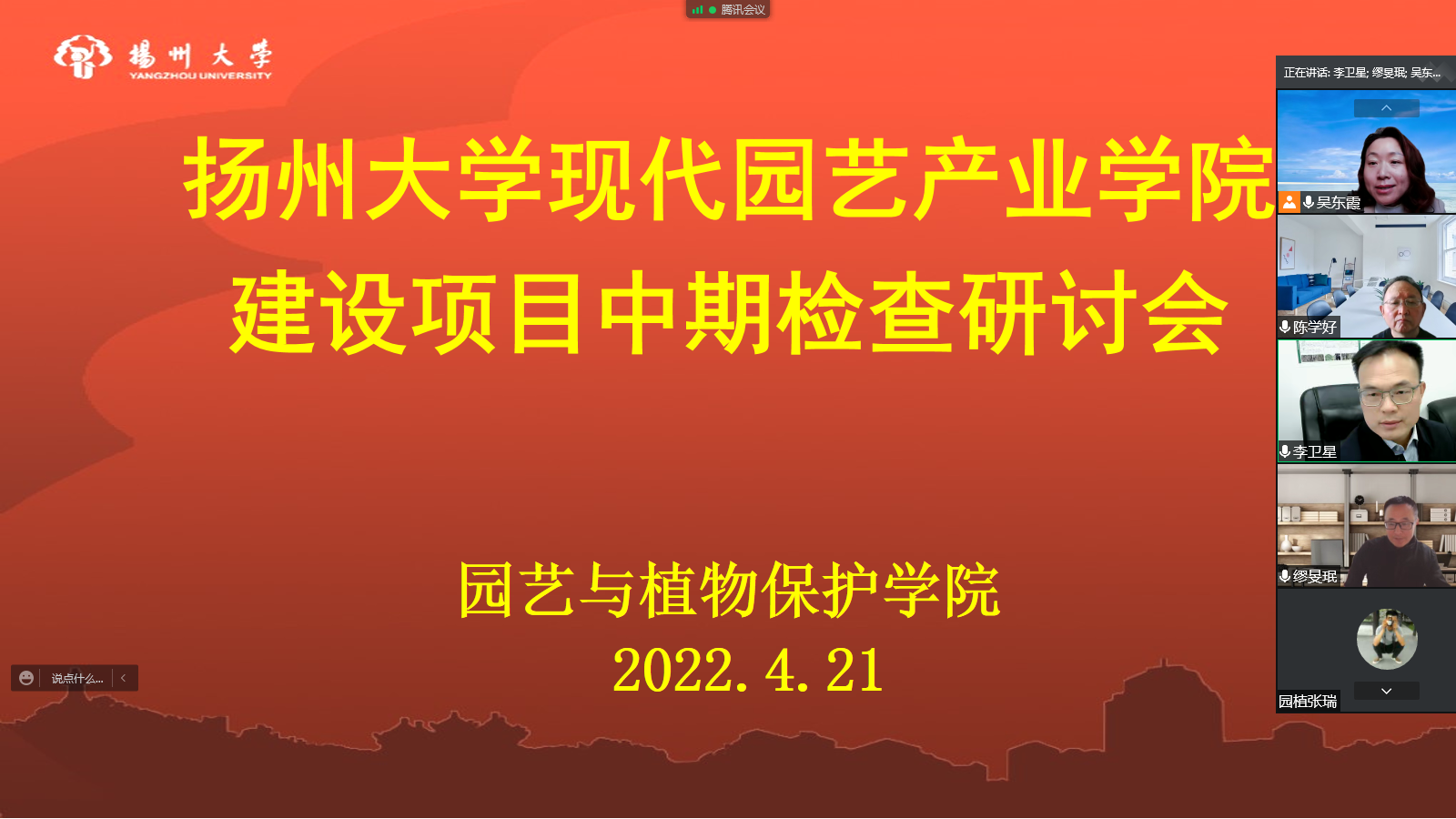 为切实推进产业学院建设,4月21日下午,我院以线上方式召开了扬州大学现代园艺产业学院建设项目中期检查研讨会。院党委书记、副院长(主持工作)李卫星、院党委副书记周超、产业学院院长陈学好以及王莉、齐晓花参加了会议。会议由副院长吴东霞主持。