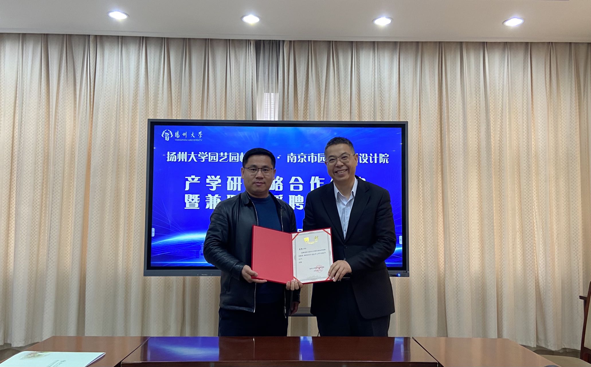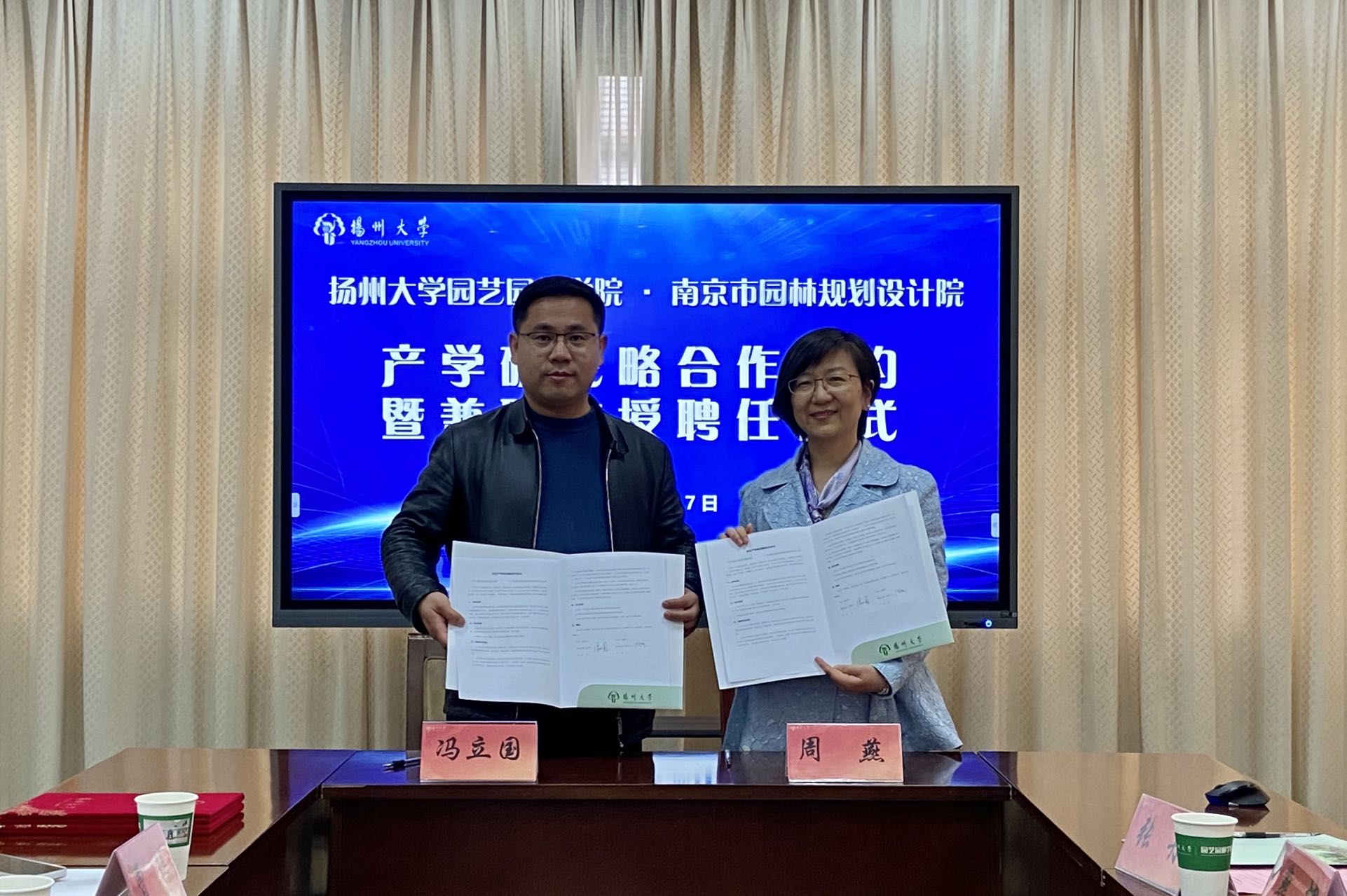 冯立国院长和周燕总经理代表双方在合作协议上签字,冯院长为承均董事长、李浩年先生颁发园艺园林学院兼职教授评书。双方将在风景园林产业发展规划,新技术、新模式示范推广,人员培训与学历提升,园林科研平台建设和学生实习实践与创新创业等方面开展全面交流与合作。