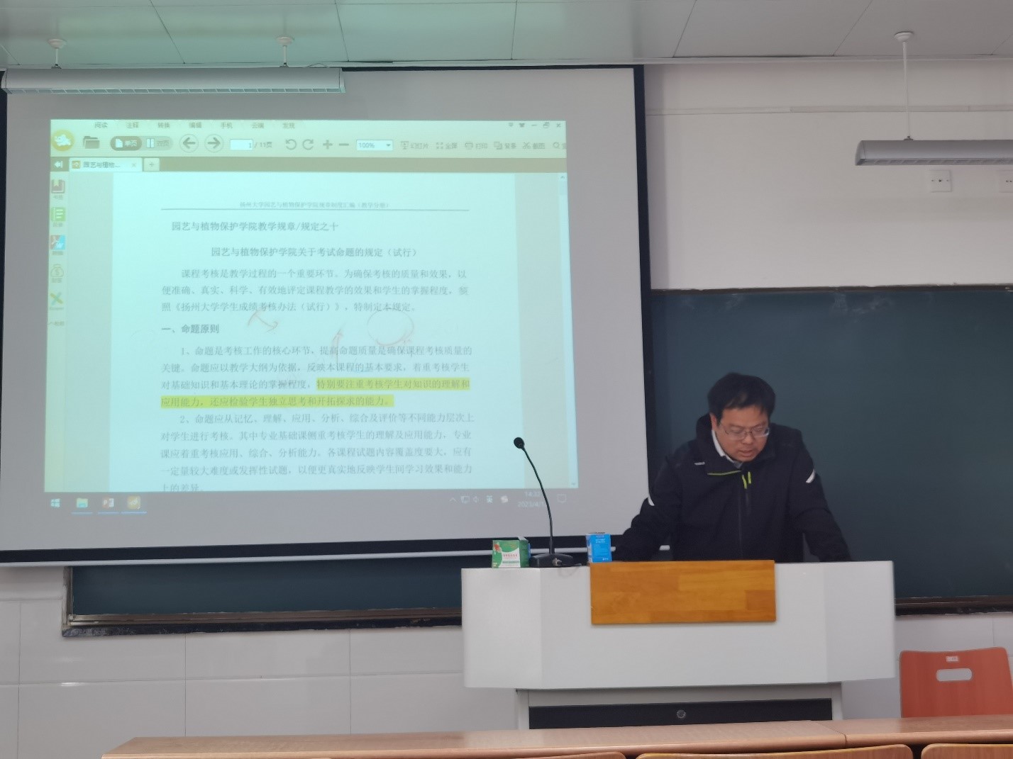 会上,园林植物系副主任孟家松副教授从考试命题原则、试题编制的要求、试卷组配的要求、试卷书写要求、课程考试方式改革申请、考试试卷审批、试卷评阅、试卷分析等方面的要求和规定进行了相关文件的解读,并针对以往试卷抽查过程中易出现的问题进行了重点强调。与会老师对考试命题中的相关要求和规定充分讨论。