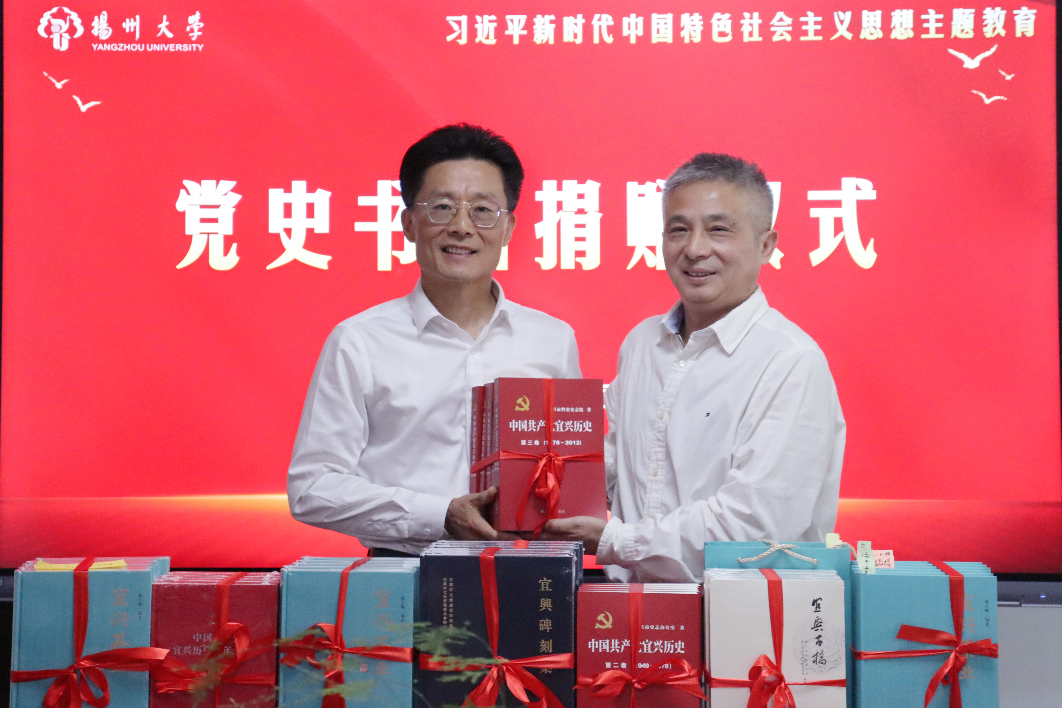 党史书籍捐赠仪环节,蒋宁鹏馆长向我校图书馆及我院捐赠《中国共产党宜兴历史》《宜兴茶业》《宜兴碑刻》《宜兴古稿》等书籍各十余套,侯三军馆长向蒋宁鹏馆长颁发捐赠证书并致以衷心感谢。侯三军馆长提到,这些宝贵的书籍不仅能完善我校的党史资料,让更多的人了解党史、学习党史,更能促进与宜兴市的友好交流,为未来更深更广的合作铺设基石。