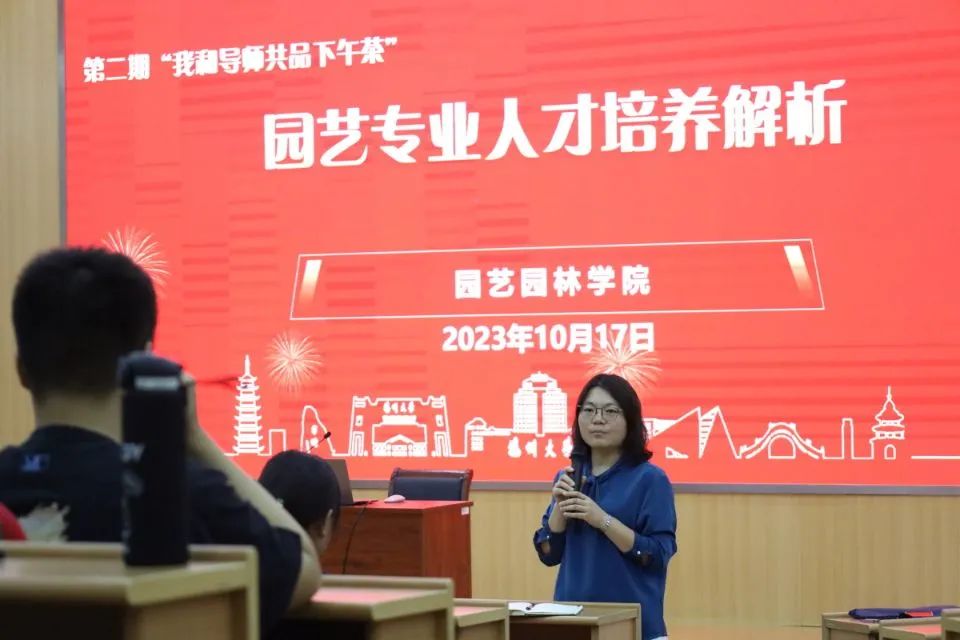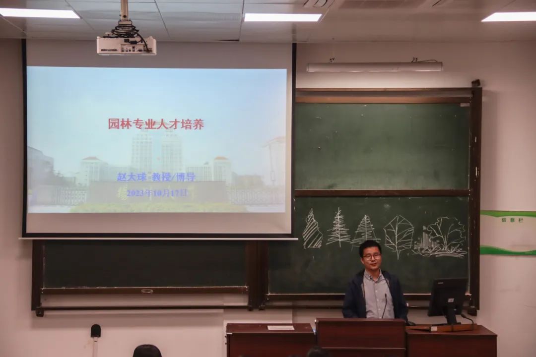 赵大球老师从“是什么”、“学什么”、“做什么”介绍了园林专业特色以及园林专业人才培养情况。他希望同学们学好专业知识并注重实践,对未来有明确的目标与合理的规划,最终成为合格的园林人。
