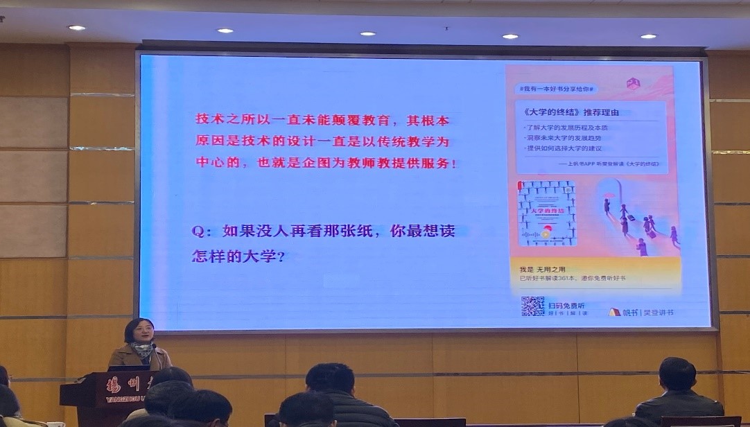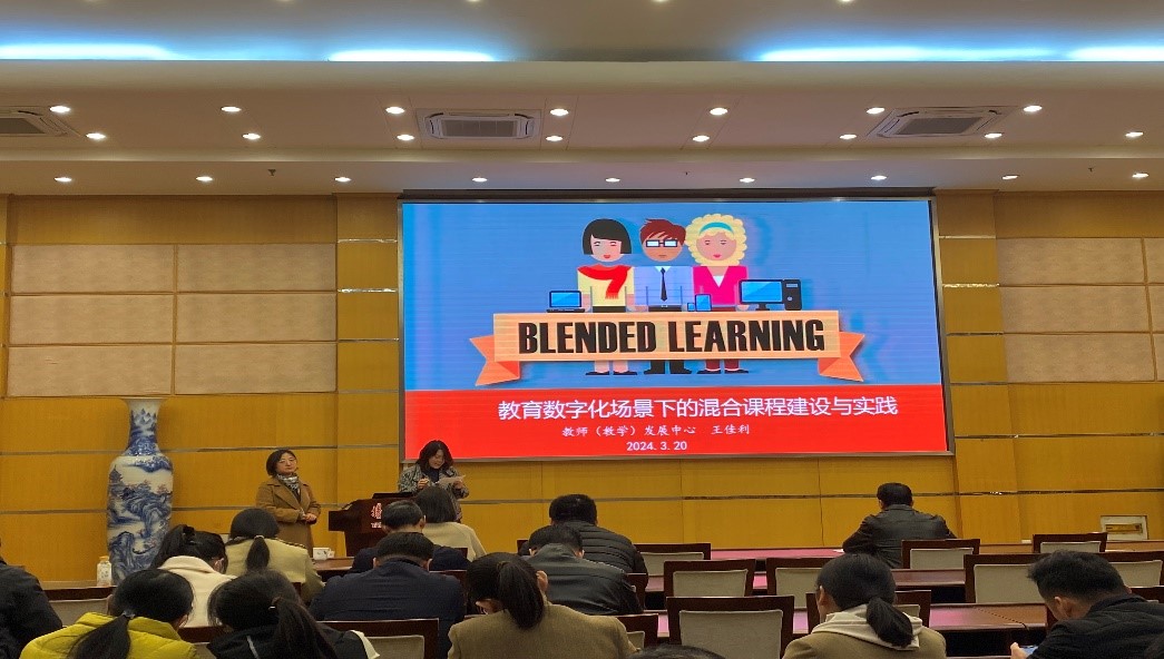 2024年3月20日下午,我院在荷花池校区二楼多功能厅举行混合课程建设培训。本次培训特别邀请了扬州大学教师发展中心的王佳利科长作为主讲嘉宾,进行“教育数字化场景下的混合课程建设与实践”的专题讲座。活动由齐晓花副院长主持,全院所有教职工参加。