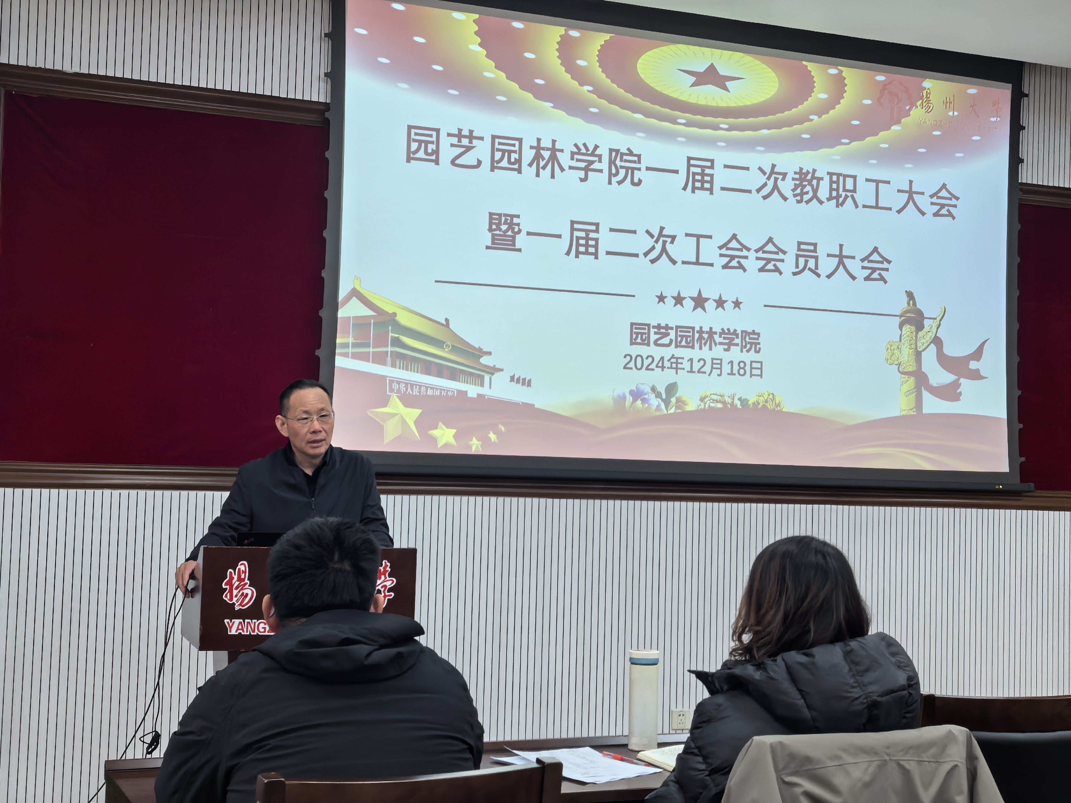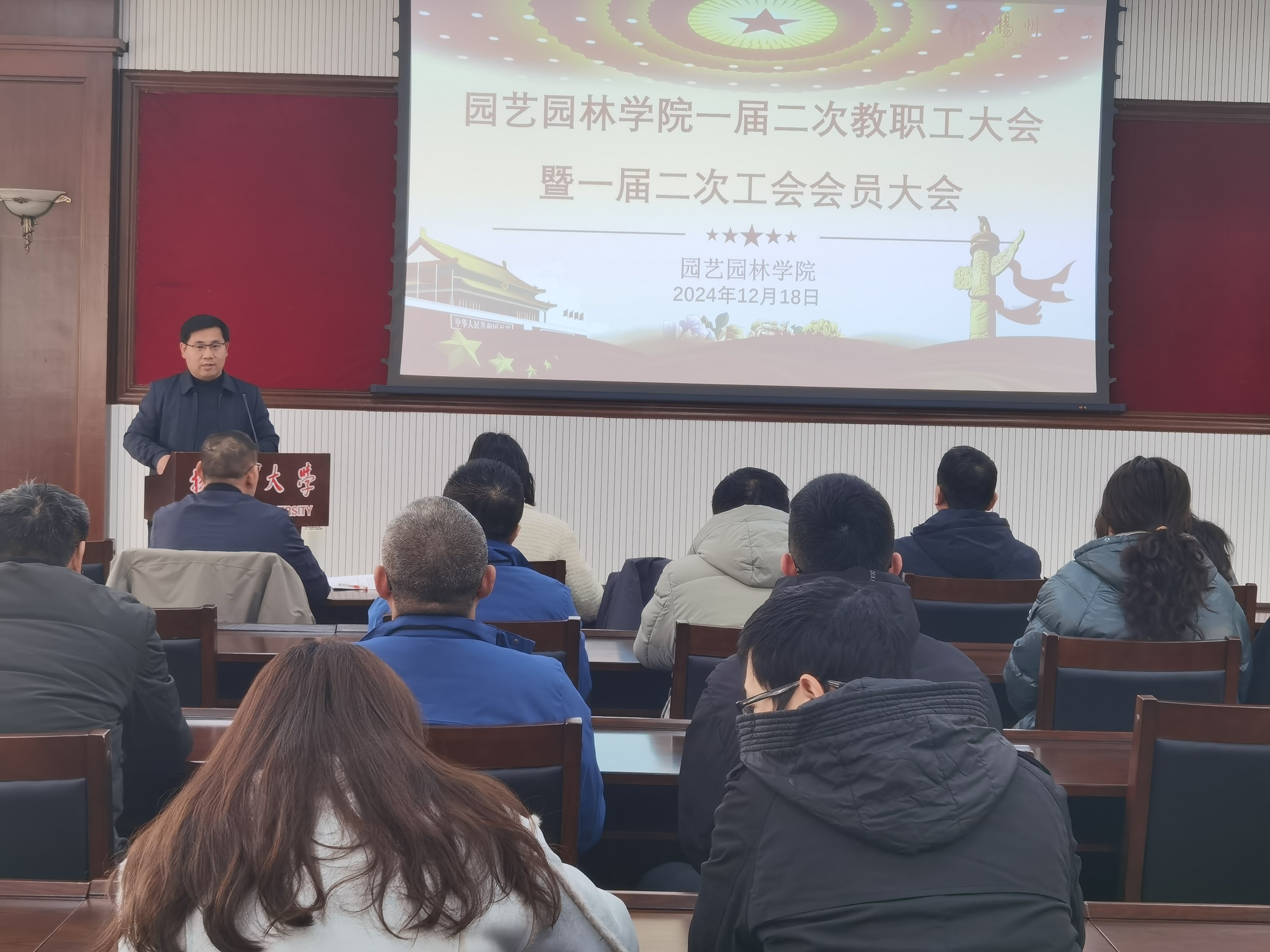 12月18日下午,园艺园林学院在行政楼报告厅隆重召开一届二次教职工大会暨一届二次工会会员大会。会议由院党委景荣书记主持,全体教职工参加会议。