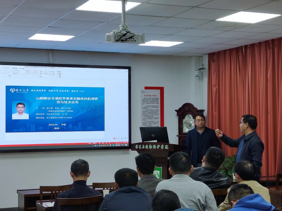 近日,山东农业大学园艺科学与工程学院胡大刚教授应邀来我院,做了题为“山梨醇信号调控苹果果实酸度的机理研究与技术应用”的报告。胡大刚教授主要围绕苹果果实品质形成和保持的机理与调控开展应用基础研究,先后获得“国家优秀青年基金”和“山东省优秀青年基金”,荣获“山东青年创新榜样”称号,主持国家及省部级课题10余项;以第一完成人获齐鲁农业科技奖二等奖1项,发表学术论文60余篇,2篇论文为Web of Science前1%高被引论文。