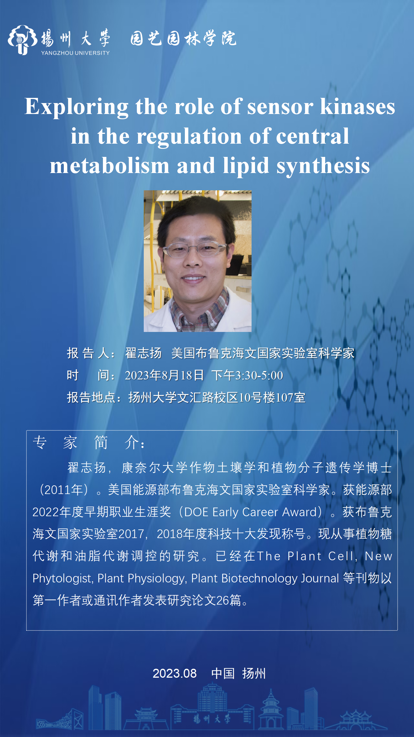 报告地点:扬州大学文汇路校区10号楼107室