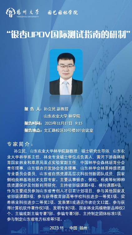 孙立民,山东农业大学林学院副教授,硕士研究生导师,山东农业大学林学系主任,林业专业硕士学位点负责人,黄河下游森林培育国家林业和草原局重点实验室副主任,中国林学会森林培育分会青年理事,山东银杏开发协会常务理事,山东林学会林草种质资源专业委员会委员,山东省自然资源高层次科技创新团队成员,国家侧柏良种基地技术支撑专家。主要从事银杏、侧柏、栎类等树种种质资源保护及创新利用研究,主持省部级课题4项、横向课题4项,作为主要成员参加山东省青创人才引育计划项目,参与其他国家及省部级课题8项;参与获得教育部高等学校科技进步一等奖1项、梁希林业科技进步二等奖2项、发表第1或通讯作者论文12篇、参与获得计算机软件著作权3项、发明专利5项、国家林业局植物新品种权2个、主编或副主编专著7部、参编专著5部、主持制定团体标准1项,参与制定山东省地方标准等5项。