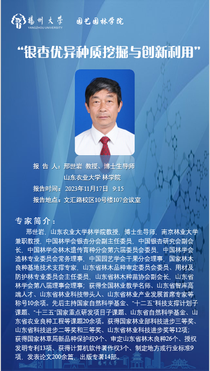邢世岩,山东农业大学林学院教授,博士生导师,南京林业大学兼职教授,中国林学会银杏分会副主任委员,中国银杏研究会副会长,中国林学会林木遗传育种分会第六届委员会委员,中国林学会造林专业委员会常务理事,中国园艺学会干果分会理事,国家林木良种基地技术支撑专家,山东省林木品种审定委员会委员、用材及防护林专业委员会主任委员,山东省林木种苗协会副会长,山东省林学会第八届理事会理事;获得全国林业教学名师、山东省智库高端人才、山东省林业科技带头人、山东省林业产业发展首席专家等称号10余项。先后主持国家自然科学基金、“十二五”科技支撑计划子课题、“十三五”国家重点研发项目子课题、山东省自然科学基金、山东省农业良种工程等课题20余项。获得国家林业部科技进步三等奖、山东省科技进步二等奖和三等奖、山东省林业科技进步奖等12项;获得国家林草局新品种保护权9个、审定山东省林木良种26个、授权发明专利13项、获得计算机软件著作权3个、制定地方或行业标准9项,发表论文200余篇,出版专著14部。