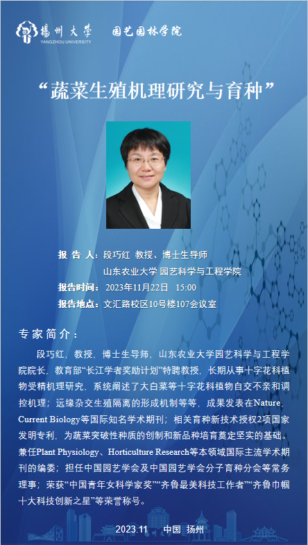 专家简介:段巧红,教授,博士生导师,山东农业大学园艺科学与工程学院院长,教育部“长江学者奖励计划”特聘教授,长期从事十字花科植物受精机理研究,系统阐述了大白菜等十字花科植物自交不亲和调控机理;远缘杂交生殖隔离的形成机制等等,成果发表在Nature,Current Biology等国际知名学术期刊;相关育种新技术授权2项国家发明专利,为蔬菜突破性种质的创制和新品种培育奠定坚实的基础。兼任Plant Physiology、Horticulture Research等本领域国际主流学术期刊的编委;担任中国园艺学会及中国园艺学会分子育种分会等常务理事;荣获“中国青年女科学家奖”“齐鲁最美科技工作者”“齐鲁巾帼十大科技创新之星”等荣誉称号。