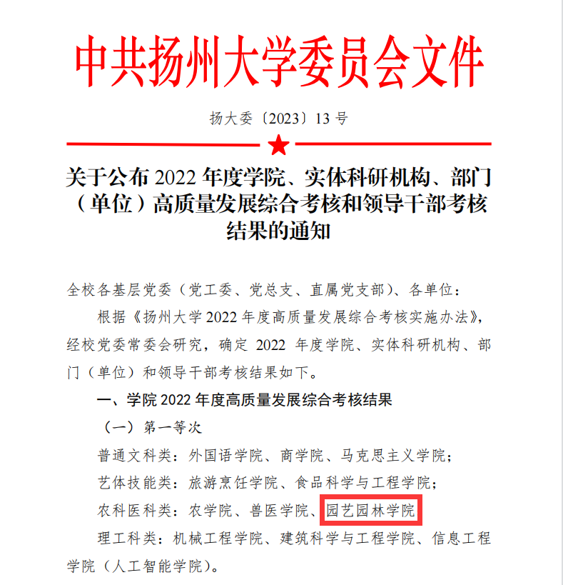 近日,校党政联合下发了《关于公布2022年度学院、实体科研机构、部门(单位)高质量发展综合考核和领导干部考核 结果的通知》(扬大委〔2023〕13号),我院获评校2022年度高质量发展综合考核第一等次。